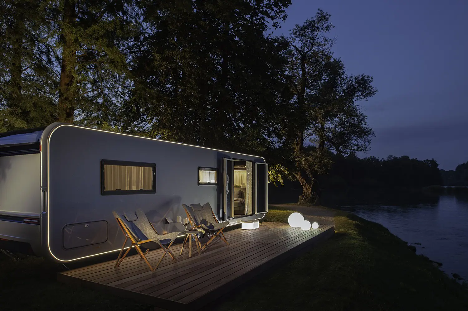 Nya Astella från Adria, inspirerad av drömmar. Eftersom du kan dra den som en vanlig husvagn eller placera den som en villavagn och enkelt flytta den när det behövs kan det vara både och.